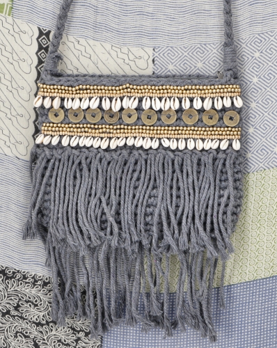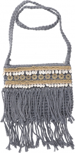 Aus weichen Baumwollschnüren in elegantem Grau wird diese wunderschöne Sommertasche in traditioneller Handarbeit in Bali gefertigt. Die leichte Tasche fasst die wichtigsten Utensilien und behält sie durch Reißverschluss sicher im Inneren. Durch das romantisch-verspielte Häkeldesign mit Fransen, Metallapplikationen und kleinen Muscheln ist die Tasche nicht nur eine solche, sondern kann als kunstvolles, eigenes Kleidungsstück angesehen werden. Durch die weiche Baumwolle des schmalen Riemens lässt sich die Tasche bequem auf der Schulter tragen.