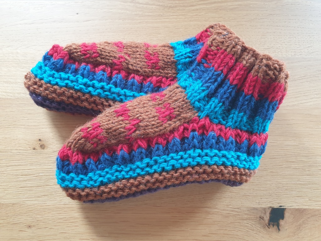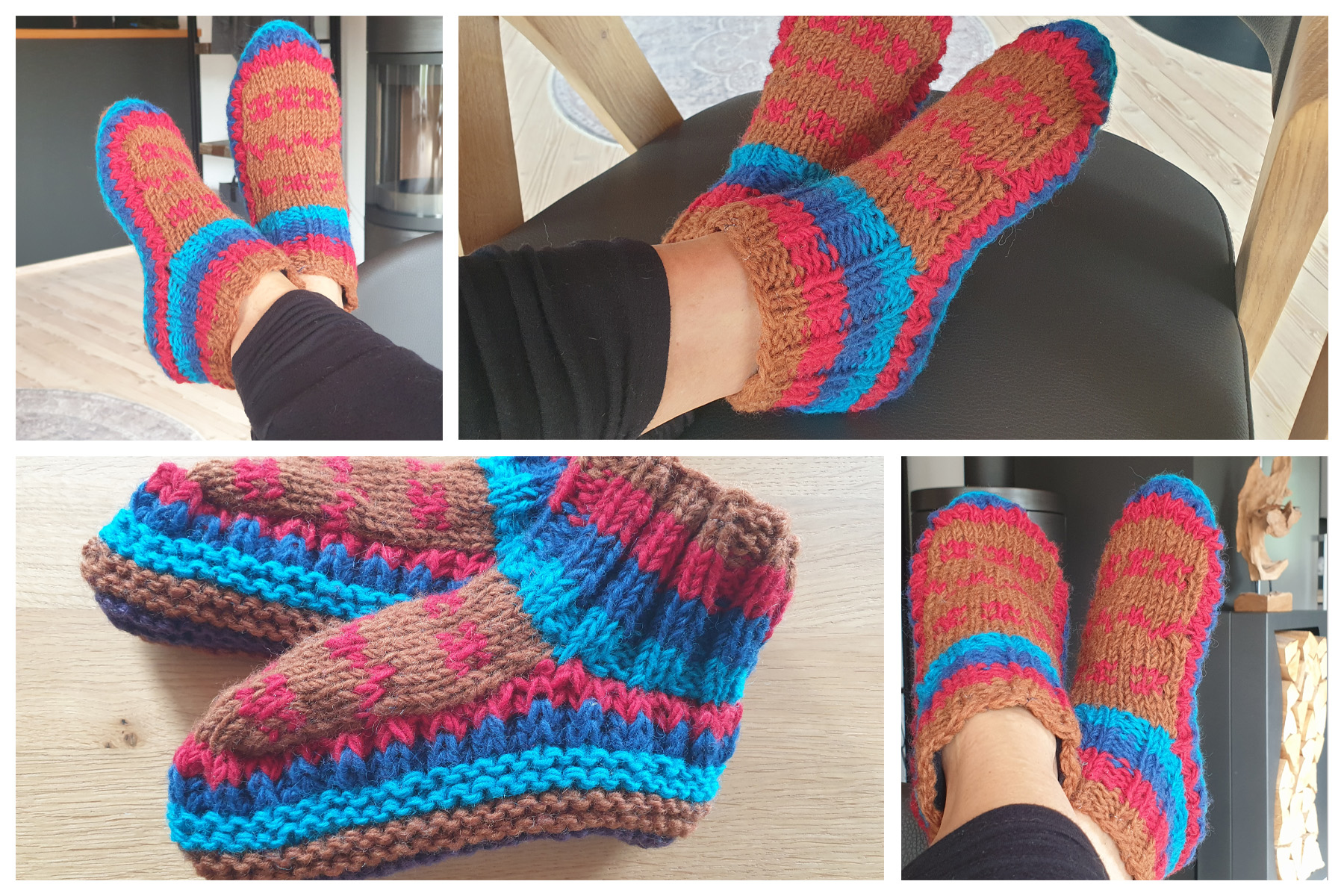 Bitte beachten Sie, dass es sich um reine Handarbeit handelt, so dass Anfang und Ende der Strickschuhe mal dicker, mal dünner ausfallen, was man beim Tragen nicht mehr spürt. Diese Wollhausschuhe haben keine separate Sohle!
