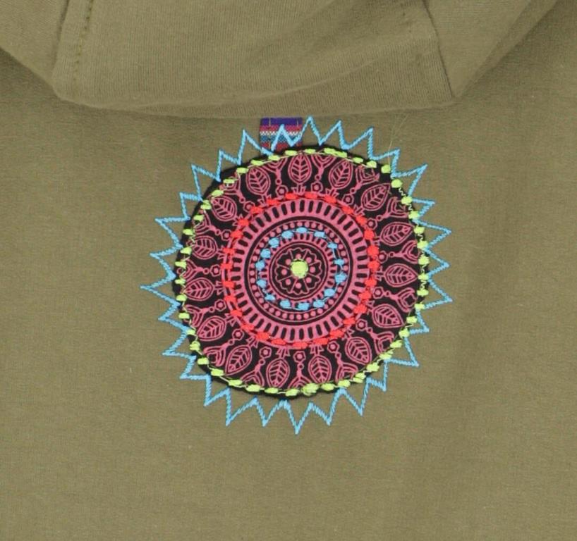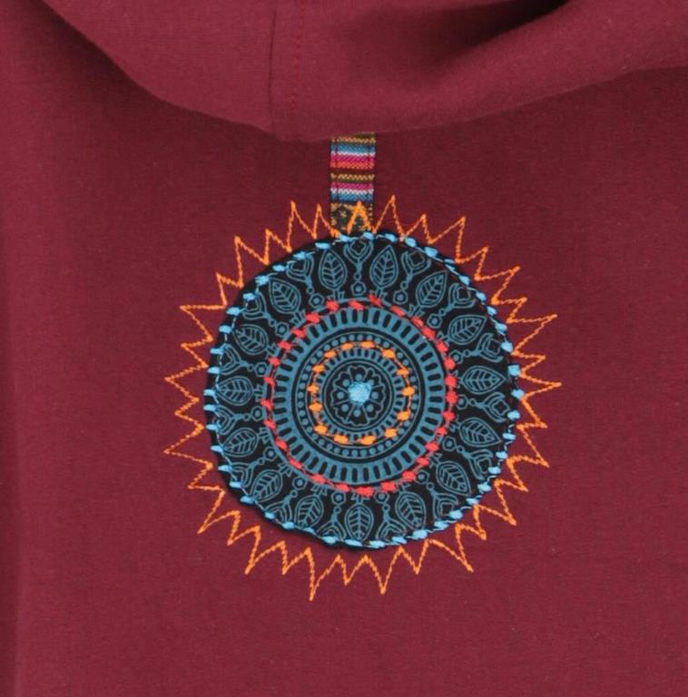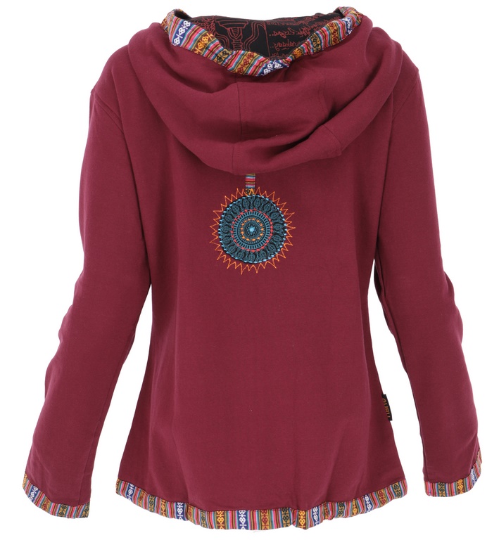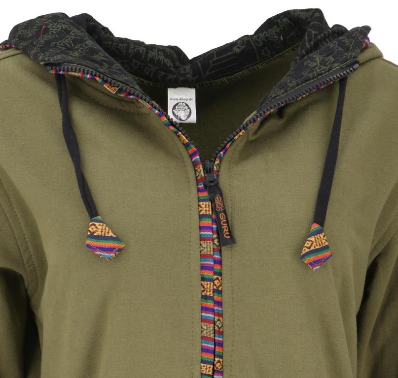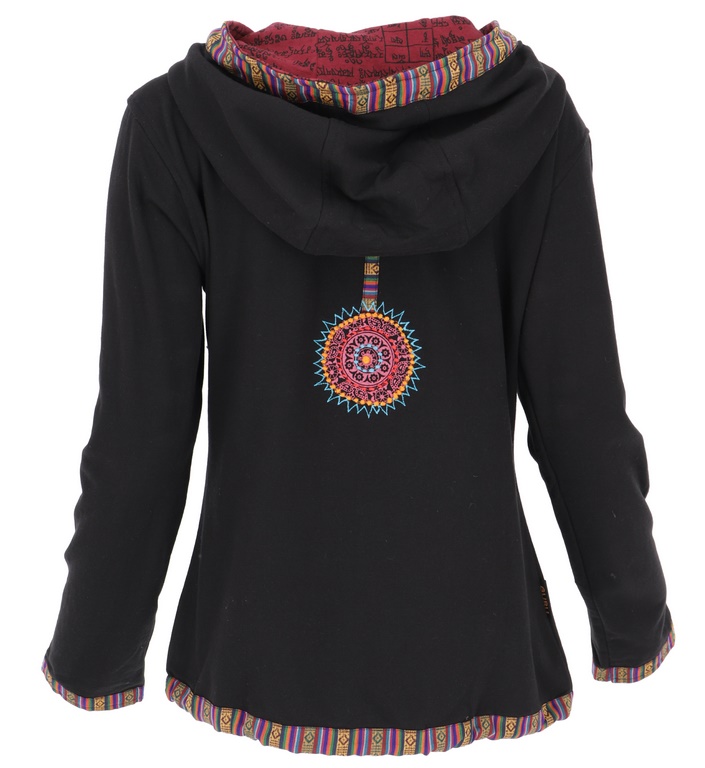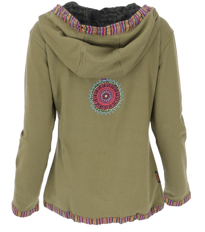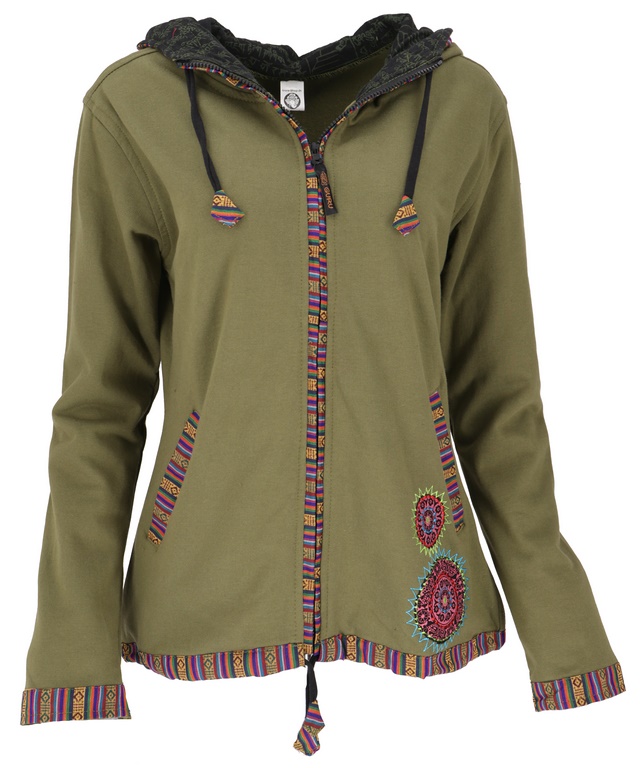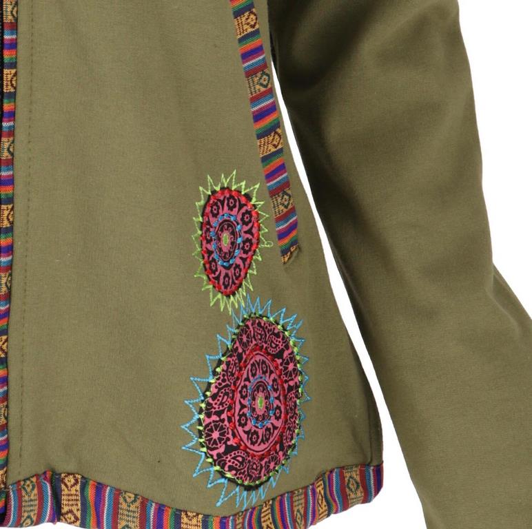 Vielleicht wird das Ihre zukünftige Lieblingsjacke? Fair gehandelt in Nepal schmiegt sich diese aus 100 % Baumwolle mit aufwendigen Details wie nepalesischer Bordüre, Stickerei und Druck im Inneren der Kapuze gefertigte, kuschelige Jacke trotz tailliertem A-Linien-Schnitt unaufdringlich an Ihren Körper. Zwei seitliche Einstecktaschen nehmen Kleinigkeiten auf oder wärmen auch einmal die Hände bei kühlerem Wetter, für welches diese Jacke durchaus geeignet ist. Die Ärmel sind schön lang, so dass auch die Handgelenke zuverlässig abgedeckt sind.